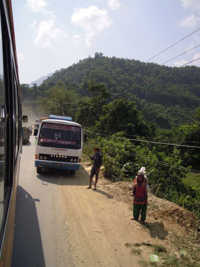 Unser Hotelmanager bucht uns 2 Plaetze im Touristenbus des mittleren Preissegments. Wir zahlen 700 Rupien (ca. 6.80 CHF) pro Person fuer eine Fahrt von ca. 7 Stunden. Waehrend der holprigen Fahrt auf einer Art Passstrasse sehen wir viel von Nepals Landesinnern.
