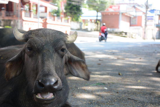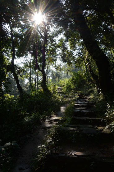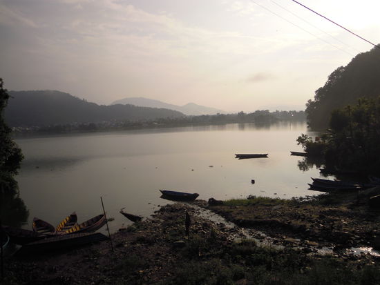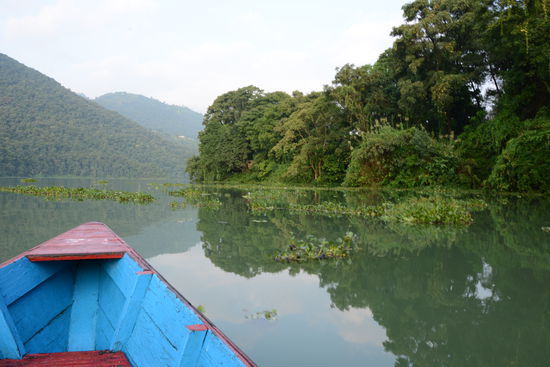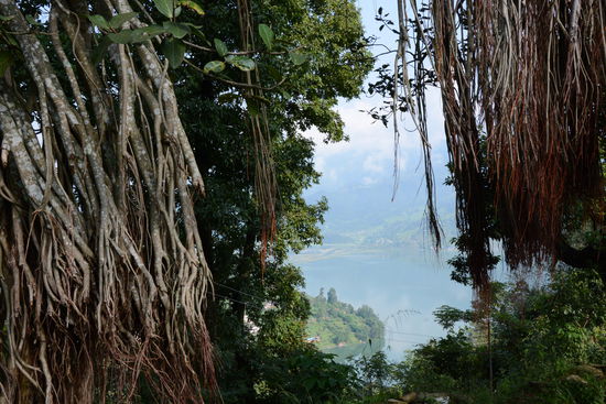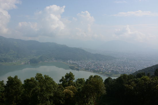 Die Stupa faellt schon von weitem ins Auge. Und so lassen wir uns per Boot am fruehen Morgen zum Ausgangspunkt am anderen Seeufer fahren. Von dort gehts steil bergauf und schon bald kehren wir zur Staerkung ein. Der Ort ist sehr friedlich, der Besitzer zeigt uns seinen eigenen Bueffel und gibt uns eine Banane aus seiner Plantage mit, die wunderbar schmeckt. Die Vegetation bezeichnen wir klar als tropisch, schon alleine wegen der Feuchtigkeit und den vielen grossen Schmetterlingen. Der weitere Anstieg ist zwar anstrengend, aber die Muehe wird belohnt. Uns erwartet ein wunderschoener Ausblick ueber das Pokhara-Tal, den See und die Berge, die sind jedoch wolkenverhangen.