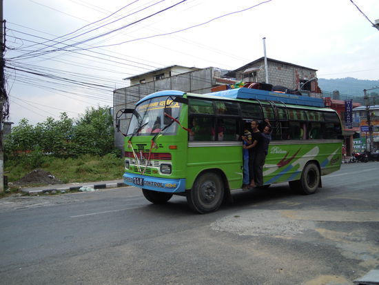 Auf der Strasse nach Pokhara, kurz nach Pame, lassen wir uns vom lokalen Bus aufladen. Im Gang stehend, schweissgebadet und durchgeschuettelt kommen wir in Pokhara an.