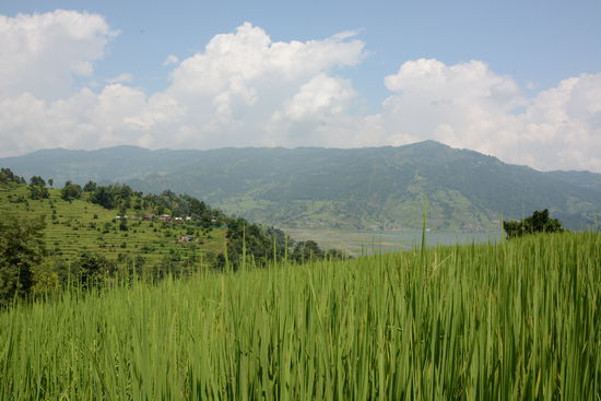 Nach der Besichtigung brechen wir zur eigentlichen Wanderung nach Pame auf. Den offiziellen Weg ueber Nehyeaal Danda verpassen wir irgendwo und befinden uns inmitten von Reisfeldern. Die Nepali, die wir antreffen sind alle sehr hilfsbereit und bestaetigen uns, dass wir in Richtung Pame unterwegs sind. Und so wandern wir gemaechlich den Berg zum See hinab. Wir treffen einen Einheimischen, der seine Bueffel zur naechsten Weide fuehrt und uns erzaehlt, dass seine Kuehe pro Tag 20 Liter Milch produzieren, die er in Pokhara verkauft. In unserer Teepause kommen wir in den Genuss von reinem nepalesisch. Der Besitzer spricht nur wenige Brocken Englisch, den Rest verstehen wir nicht. Ups, das war wohl ein Yes zuviel, denn ploetzlich steht ein selbstgebrannter Raksi vor Pascal. Prost!
