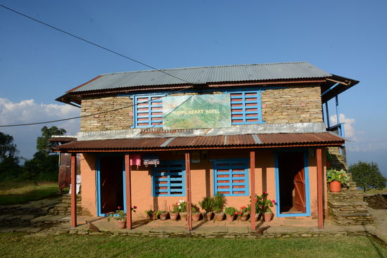 Voellig geschafft nehmen wir die restlichen 2 Stunden Wandern in Angriff. Einmal falsch abgebogen, wieder zurueck und endlich -Halleluja!- erreichen wir das Dorf Panchase Bhanjyang. Hier treffen wir endlich wieder auf menschliches Leben. Dieses schoene Fleckchen Erde entschaedigt uns fuer die Strapatzen. Die Hotelinhaber erzaehlen uns, dass erst 2 Tage vorher diese nuetzlichen Markierungen angebracht wurden. Dies fuer den geplanten Marathon (!) am 10. Oktober. Wir denken gar nicht daran, wie unsere Blutegel-Bilanz ohne Markierungen ausgegangen waere. Den Abend lassen wir inmitten der Gastfamilie ausklingen, die sich mit Sticken und Kartenspielen beschaeftigen.