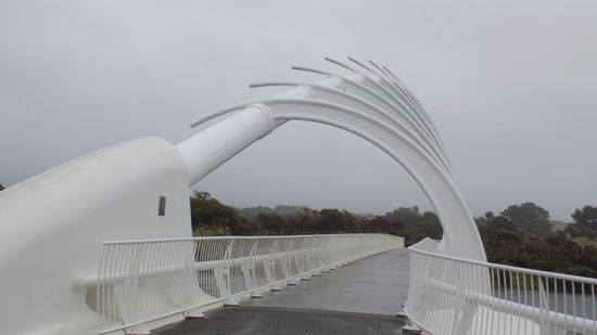 eine der erklärtermaßen schönsten Fussgängerbrücken der Welt, die nur dazu dient den Radfahrern und Coastal- Walkway-Strandentlangwanderern die Überquerung eines kleinen Flusses zu erleichtern. Woanders hätte man so ein tolles Stück, für alle sicht- und erreichbar mitten in die Stadt gebaut, aber hier wird das gute Stück mitten im Niemandsland versteckt, Obelix lässt grüssen. Den Rest des Tages verbringen wir vor einer Spark-Station im Internet und fahren abends dann wieder zu unserem SP beim Aquatic Center zurück. Der Regen hat zwar mittlerweile aufgehört, aber die Open-Air Veranstaltungen im Park sind für heute mittlerweile abgesagt, bleiben wir eben im Auto und gehen mal früher zu Bett.