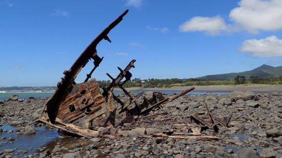 finden am Ende der Timaru Road die Überreste der SS Gairloch, die 1903 hier auf ein Riff lief und seither (also schon über 110 Jahre!!) vor sich hin rostet.