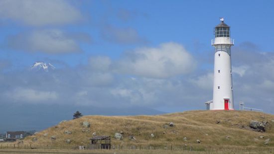 Am Ende der Cape Road stossen wir auf das Cape Egmont Lighthouse, das schon seit 1888 hier den Schiffen den Weg weisst,