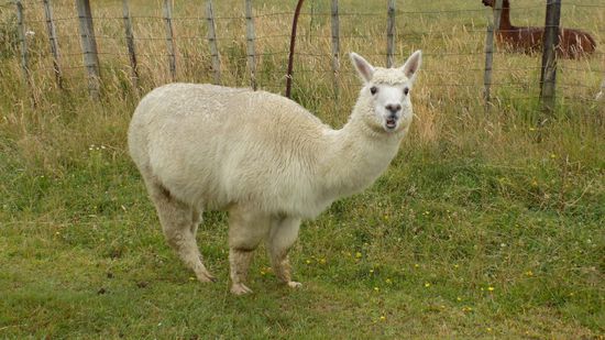 sehen am Strassenrand ein paar grasende Alpaccas,