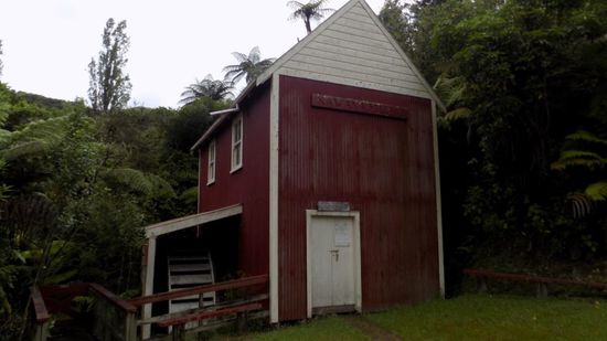 eine Getreide-Mühle die 1880 erbaut wurde, um 1913 den Betrieb einstellte, lange vor sich hin rottete und nach Renovierung um 1997 vom Premierminister von NZ der Öffentlichkeit zur Besichtigung übergeben wurde. Drunten am Fluss eine Gruppe Kajak Fahrer,