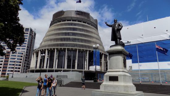 Unser letzter Tag auf der Nordinsel bricht an, wir fahren die letzten 60km nach Wellington, der Hauptstadt von NZ, beziehen dort gleich mal auf dem NZD 50 teuren Motorhome Platz Waterloo Quay unser Quartier – direkt am Hafen gelegen, nur 500m von der Fähre entfernt, mit der wir morgenfrüh auf die Südinsel übersetzen wollen, aber ansonsten ein völlig unromantischer, an einer Durchgangsstrasse gelegener, geteerter Parkplatz mit angeschlossenen Toiletten – und Warmdusch-Kabinen. Wir brechen auf zur Stadtbesichtigung, gehen die Whitmore Street entlang und kommen zum Bienenstock,