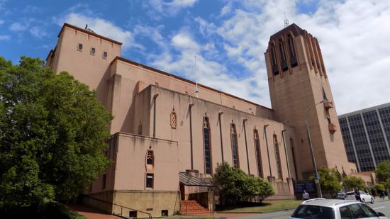 Teil der Parlamentsgebäude von NZ. Da wir auf die Tour durch das Parlament gut eine Stunde warten müssen, streifen wir ein wenig durch die nähere Umgebung, kommen erst an der neuen, modernistischen St. Pauls Cathedral vorbei,
