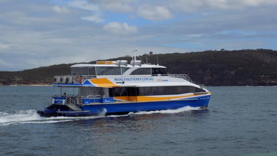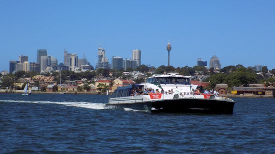 wobei wir diesen Kuschelsessel ausgesprochen schön finden, geht es zum Circular Quay, von wo aus wir erst mal der Manly Fastferry beim abheben zusehen,
