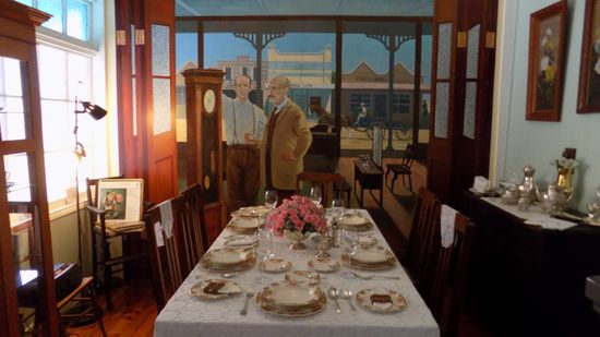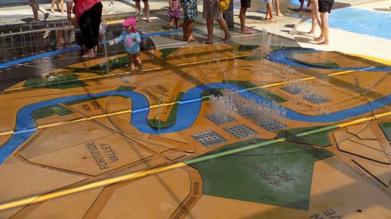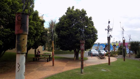 und ihr Modern Arts Museum berühmt, dessen Garten von diesen modernen Aboriginal Arts Totem-Pfählen??? verziert wird.