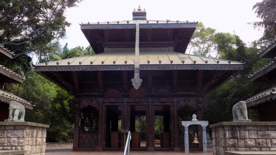 das Nepal House, ein Überbleibsel von der Expo 2008 beeindruckt durch seine reichen Schnitzereien,