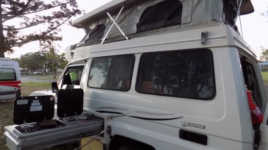 Wir lassen unsere Fenster mit Sonnenschutzfolie verdunkeln, ein 200W Solarpanel kommt aufs Dach, eine Zentralverriegelung wird eingebaut, wir basteln uns eine echte Aussendusche, bauen gleich noch die Innenbeleuchtung auf LED um, besuchen mehrere Reifenhändler, denn breitere Geländereifen müssen auch noch drauf und lassen uns von ARB ein Angebot für weitere ‚Verschönerungen‘ wie Bullbar, Winde, Kompressor u.ä. machen. Samstag werden erst mal noch einige Kleinigkeiten eingekauft und dann fahren wir raus aufs Land zum Campinggelände am Tully Memorial Park, wo wir dann einen ganz ruhigen, entspannten Camping-Sonntag verbringen.