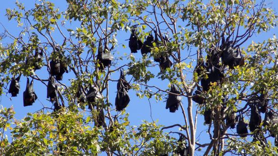 Drei benachbarte Bäume sind von Fruit-Bats besiedelt,