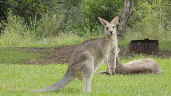 Um mit Shangri La 3 zum ersten Mal ‚in den Busch‘ zu gehen, fahren raus aufs Land bis Jimna, wo wir in der Tourist Info mit Karten und Tipps für ein paar einfache Strecken ausgestattet werden. So erreichen wir u.a. auch den NP-CP Peach Trees Park, wo wir auf die ersten Kängurus auf dieser Reise treffen.