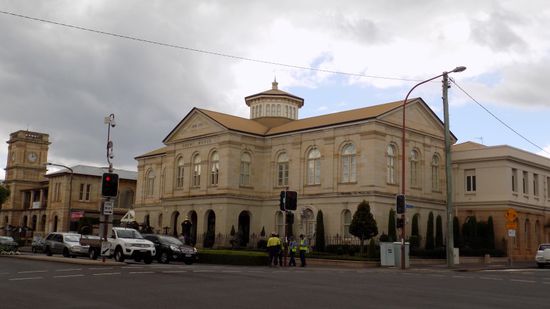In der Innenstadt von Toowoomba, mit 120.000 Ew die grösste im Binnenland gelegen Stadt von Queensland, stellvertretend für die zahlreichen noch gut erhaltene Häuser aus der Jahrhundertwende, das alte Court House.