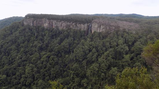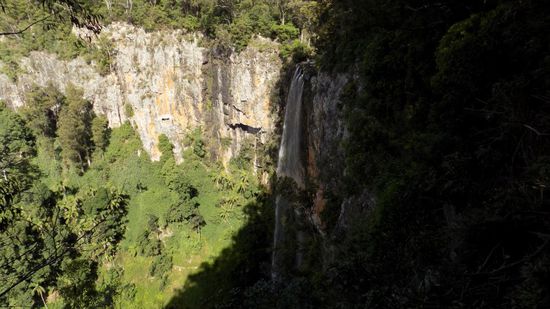 die uns nach unten, bis an den Fuss der Fälle brachte. Wir sind wieder droben auf dem Berg und nutzen daher die Gelegenheit, die Comdamine River Road gleich nochmals hinunterzufahren. Die Nacht verbringen wir auf dem SP Rest Area in Rathdowney, am nächsten Morgen geht es weiter durch Beaudesert in den Springbrook NP, westlicher Teil zur Natural Bridge,