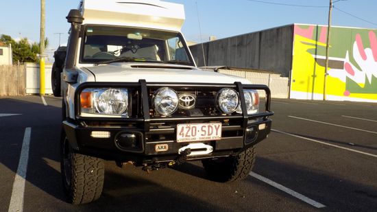 Wir vertrödeln den Morgen und fahren dann langsam, von einigen Einkaufsstopps unterbrochen zurück nach Brisbane auf ‚unseren SP‘ in Nundah, stehen dann früh relativ früh wieder auf und liefern SL3 bei ARB zur Verschönerung ab. Wir fahren mit dem Zug nach Brisbane Downtown, besuchen kurz ein Einkaufszentrum und treffen dort auf unseren neuesten Reisebegleiter ‘Azul‘, einen Tablett PC, der uns dann stundenlang beschäftigt, ihn mit Upgrades, Einrichten, eben tun was halt sonst so nötig ist, um ein Gerät aus dem Fabrikzustand in die benötigte Konfiguration zu bringen. Am späten Nachmittag dürfen wir SL3 für sie Nacht abholen, sein neues Gesicht mit Bullbar, Scheinwerfern und Winde,