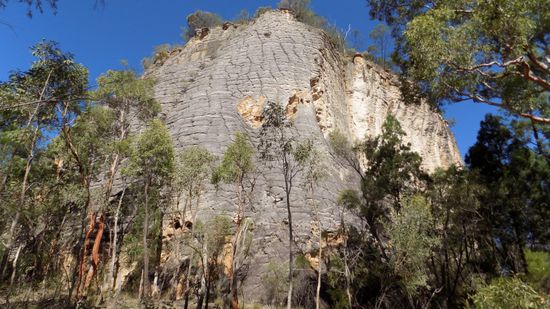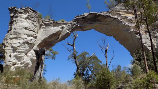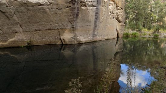 einem beeindruckenden Sandsteinfelsen, ein kurzer Besuch im Info-Center, wo wir uns die Genehmigung für Nacht auf einem CP im Park abholen (AUD 5,95 pP / N) und schon sind wir unterwegs auf den teils recht anspruchsvollen Tracks in diesem Park. Wir besuchen die Murder Site, wo einst 2 Viehdiebe 2 Polizisten umbrachten und die Inceneration Site, wo die Leichen verbrannt wurden, fahren bis zum Quelle des Carnarvon Creeks und sehen unterwegs neben den allgegenwärtigen Kängurus