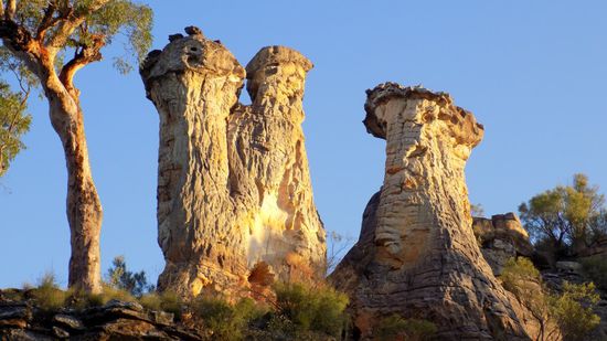 von Wind und Wetter geschaffene Sandsteintürme. Es dämmert, wir verlassen den Park und schlagen an der Slab Hut, die uns bereits bei der Anreise ins Auge fiel, unser erstes ‚Bush Camp‘ auf.