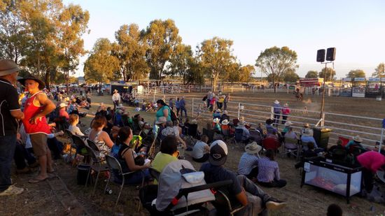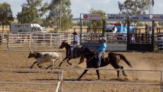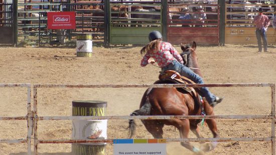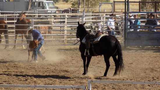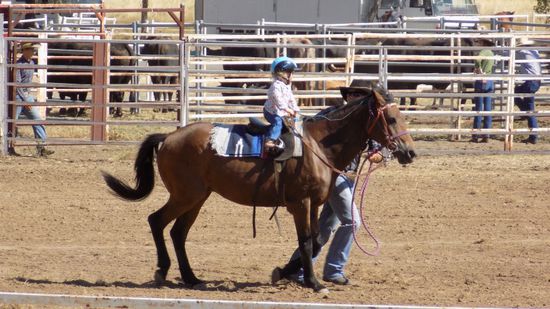 Pünktlich um 14h sind wir auf dem Rodeo Gelände, haben schon mal AUD 10pP Eintritt bezahlt, bekommen dafür ein Armband, auf dem steht, ‚dass wir alt genug sind um alkoholische Getränke zu kaufen und zu geniessen‘ und dann erleben wir erst mal Rodeo – Nachwuchsförderung. Zwar teils noch Windeln in der Hose, aber schon hoch zu Ross