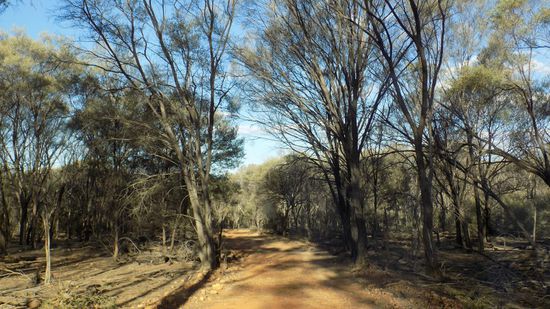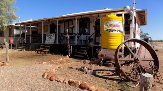 Wir übernachten auf einem SP am Lake Dartmouth, bevor wir dann am nächsten Morgen erst mal bis Adavale weiterfahren, ein Ort, einst Bezirkshauptstadt, aber dann wurde die Eisenbahn 80km weiter südlich verlegt, dann kam die grosse Überschwemmung von 1963 und heute leben hier noch 19 Einwohner und 1 Polizist. Mittelpunkt des Ortes ist die Bushbar mit angeschlossenem Gemischtwarenladen und Postamt