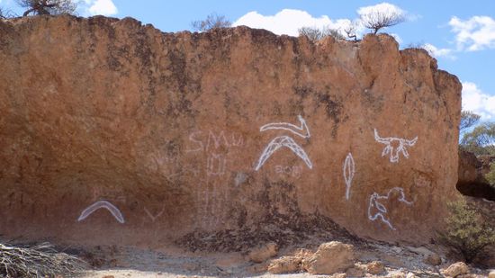 man könnte hier auch mal eine Woche verbringen, aber wir nehmen die nächsten 220 km Staubpiste in Angriff. Kommen auf dem Weg zum Idalia NP an solcher Rock Art (Graffiti??) vorbei,