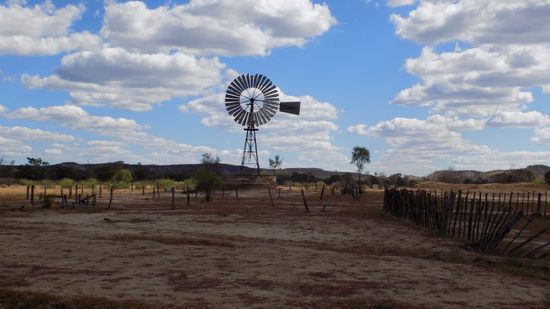 Der Feste sind genug gefeiert, wir wollen endlich km sehen, also fahren wir auf dem D’Aguillar Hwy Richtung Westen bis Dalby, wo wir auf den Warrego Hwy treffen, eine der grossen W-O Verbindungen hier in Queensland. Rinderfarmen werden von Baumwollplantagen abgelöst, bis wir dann nur noch durch steppenartige Landschaften kommen. Höhepunkte am Wegesrand sind Kleinstädte wie Chinchilla und Miles, wo riesige Getreidespeicher am Bahndamm stehen. Wir erreichen Roma, die erste sehenswerte Stadt hier, in der man bei der Suche nach Wasser auf Öl und Erdgas stiess. Dies wird natürlich immer noch entsprechend gefeiert und der Besucher kann sich jeden Abend für AUD 12 diese Geschichte in einer Light and Sound Show erzählen lassen. Wir begnügen uns damit Romas grössten Flaschenbaum,