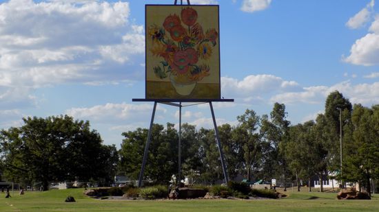 Vor dem Rathaus ein paar (250 Mio Jahre alte) versteinerte Bäume, im Stadtpark auf einer 23m hohen Staffelei die Sonnenblumen von Van Gogh