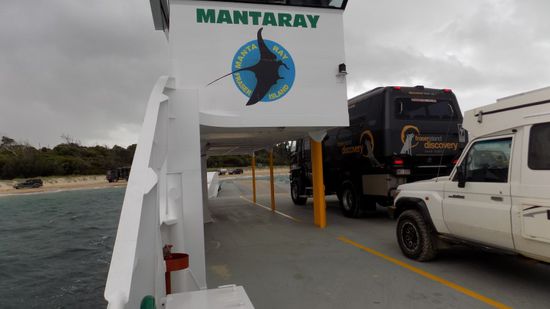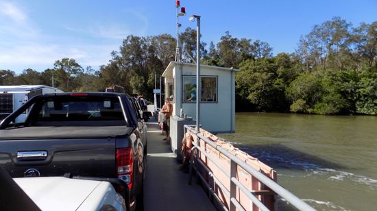 Weiter nach Tewantin, wo wir uns in Nationalpark Büro das Combi Permit (1 Monat lang gültig, AUD 75,) für den Great Sandy NP Cooloola Section und Fraser Island Section kaufen und gleich mal noch ein 3 Tage Camping Permit für die Cooloola Section dazu buchen (AUD 5,95 pP / N). Auf einem kleinen Fährponton wird übergesetzt (AUD 7)
