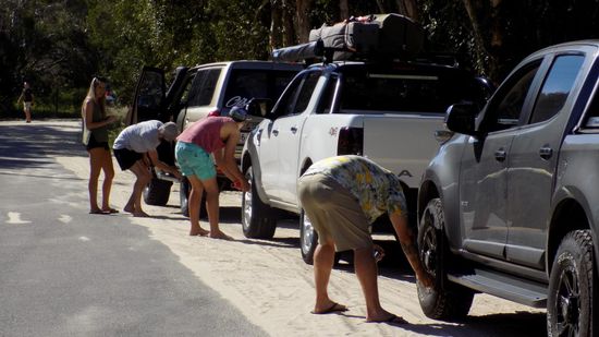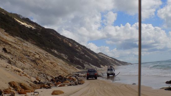 und bei der Abfahrt zum Strand, der zweite Fahrfehler des Tages, wir nehmen die ‚windabgewandte‘ Seite, Unmengen von losem Sand – und stecken zum zweiten Mal für heute fest. Erst wieder einmal Schaufeln, Graben, dann ein paar freundliche Helfer mit diesen modernen Kunststoff-‚Sandblechen‘ (sobald ich weiss, wo ich die verstauen kann, werden die gekauft) und wir sind wieder frei, können endlich Fraser Island erkunden.