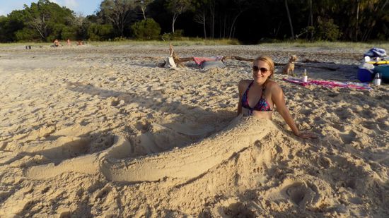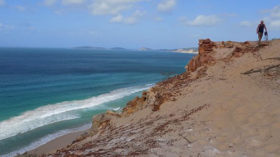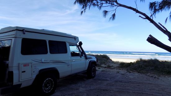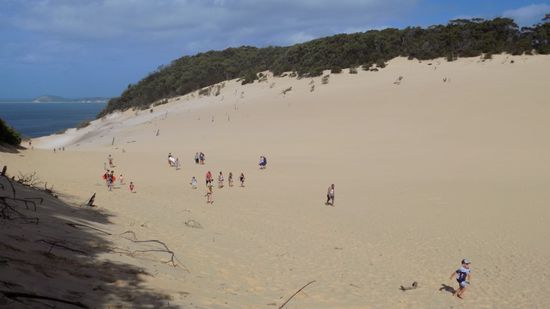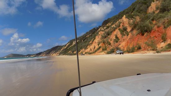 Die letzten km bis zum Ort Rainbow Beach dann ‘normale‘ Schotterstrasse. Wir füllen unsere Diesel und Wasservorräte auf, kaufen uns ein Ticket zur Überfahrt nach Fraser Island (AUD 120 H/R), buchen für dort gleich noch mal 4 Nationalparkcampingnächte (AUD 5,95pP/N) und wandern dann zur Carlo Sandblow