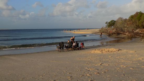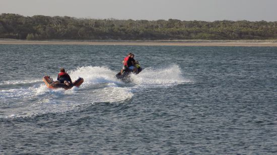 das wollen wir in ein paar Tagen näher untersuchen und dann geht es raus auf die ?? Peninsula, dem Absprungpunkt zu Fraser Island, wo wir uns auf dem NP CP M.V. Sarawak niederlassen. Bei einer kleinen Strandwanderung treffen wir auf Jetski Fahrer,