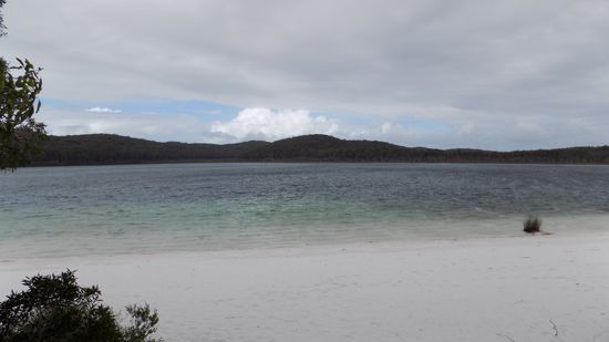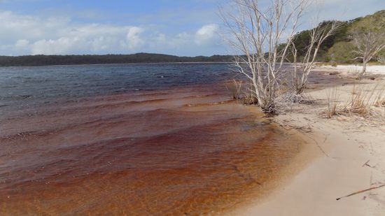der grösste ‘perched Lake’ weltweit, einer der vielen, dieser von Dünen eingeschlossenen Seen hier auf der Insel, von Regenwasser gefüllt, dieser durch Tannin mit einer ‚honigbraunen‘ Wasserfarbe. Ein paar km weiter Lake Birrabeen, glasklar, kühl, blau, endloser weisser Sandstrand