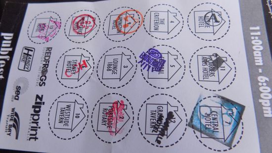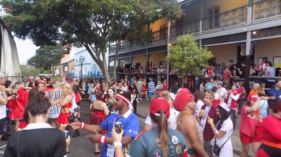Aber trotzdem ist hier ‚Down under‘ alles irgendwie anders. Wir waren bisher gewohnt, dass solche Parties von 11h Nachts bis 6h Morgens dauern, hier gehen solche Feste von 11h Morgens bis 6h abends – nur zum Festende sind die Gäste anscheinend überall gleich ‚gut drauf‘. Wir hatten eigentlich von einem rekordbrechenden Bar Crawl ein grösseres Gedränge erwartet, aber auf dem Strümpfelbacher Weinfest ist mehr los. Hier sind die Strassen, die Gehwege frei zugänglich, leere Parkplätze in Hülle und Fülle vorhanden, die einzige Wartezeit von ca. 50 sek. entsteht durch die Ausweiskontrollen an den Eingängen zu den Lokalen. Wir geniessen Country- und Karaoke Sänger