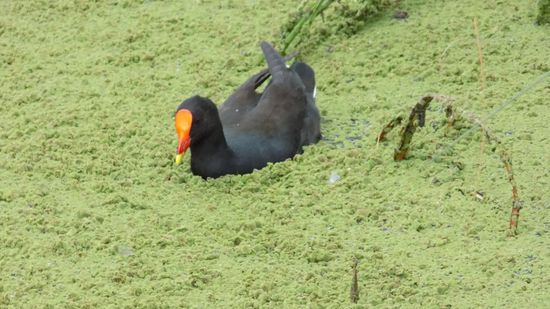 einer Lagune, in der sich Enten und andere Wasservögel durch dieses grüne Zeug pflügen,
