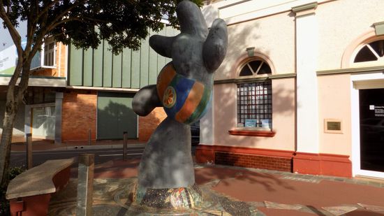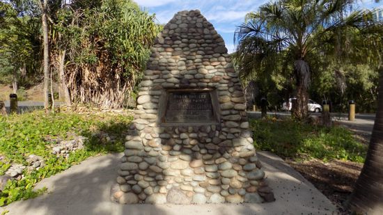 das von 5 zeitgenössischen, lokalen Künstlern erstellt wurde. Wir fahren ans Meer nach 1770, der einzigen Stadt weltweit, deren Name aus einer Zahl besteht. Dies in Erinnerung an das Jahr 1770 in dem James Cook zum ersten Mal australischen Boden betrat und das mit diesem Cook Memorial auch entsprechend gewürdigt wird.