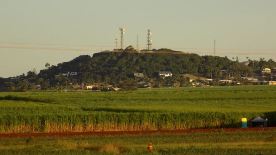wie der Nameschon sagt, ein kegelförmiger Berg, der einen 360° Panoramarundblick bietet. Im Hintergrund die weltgrösste Aluminium Schmelze, die ihren Strom praktischerweise aus diesem fast nebenan gelegenen, riesigen Kohlekraftwerk in Callemondah bezieht,