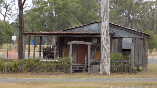 finden wir – leider zu früh für heute - einen dieser schön gelegenen, kostenlosen und daher auch gut besuchten Buschcamp CP’s, im Calliope River Historical Village (AUD 5 pP), in dem so etwa alle zwei Monate einer der grössten Märkte von Queensland stattfindet, beschränken wir uns auf ein paar Aussenaufnahmen