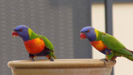im Hintergrund der (Kohle)-Hafen von Gladstone und im Vordergrund diese zwei Papageien, beim Nachmittagssnack.