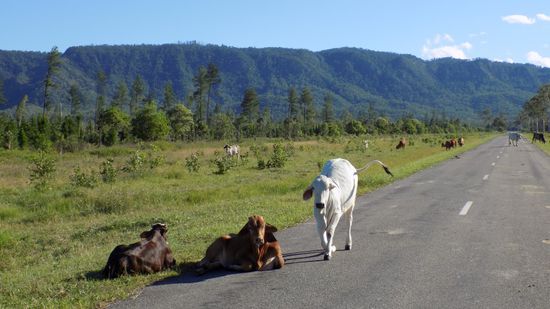 das hier krampfhaft versucht vom Ruhm seines Vorgängers zu zehren, der durch den Song ‚Pub with no Beer‘ Unsterblichkeit erreichte. Aber dieser modernistische Bau, der Charme der Bar irgendwo zwischen Milchbar und Eisdiele, der sogenannte Biergarten erinnert eher an einen Wäschetrockenplatz mit Plastikbestuhlung. Wir wenden uns mit Grausen und fahren weiter auf Landstrassen, auf denen die Rindviecher das Wegerecht, die Vorfahrt haben