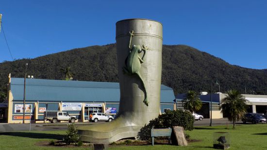 Unser erster Stopp heute in Tully, dem nassesten Ort Australiens, gilt diesem 7,9m hohen Gummistiefel, der an die Rekordregenmenge von 1950 erinnern soll,