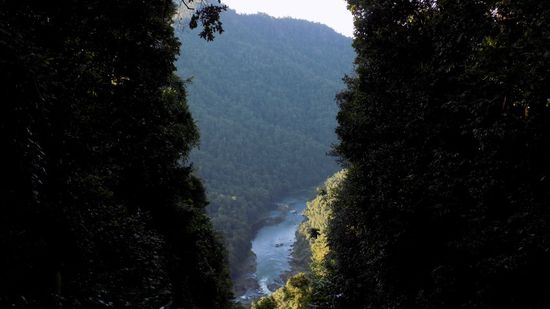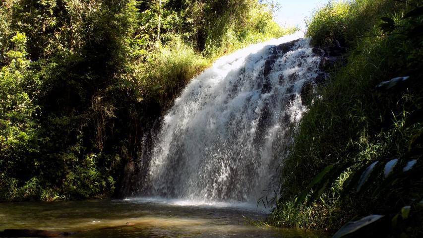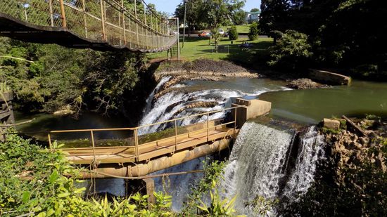 nach Mena Creek. Auf einer schwankenden Hängebrücke überqueren wir den Wasserfall,