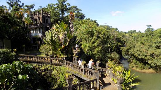 und stehen drüben vor dem Paronella Park (E=AUD44,- pP). Hier hat sich um 1930 ein Spanier seinen Traum von einem Schloss in den Tropen verwirklicht und praktischerweise den Wasserfall gleich zum ersten Wasserkraftwerk Queenslands mitverwendet. Seit 80 Jahren kann das ganze nun besichtigt werden und obwohl mittlerweile die Eintrittskarte sogar für 2 Jahre gültig ist verzichten wir auf den Besuch, lassen uns auch von einem ‚nur einer bezahlt, der andere darf umsonst mit rein‘ nicht umstimmen, schauen uns lieber Wasserfall und Park vom (kostenlosen) gegenüberliegenden Ufer aus an