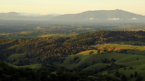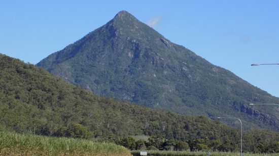 Wir fahren zurück an den SP Gordonvale Rest Area am Bruce Highway, von wo wir am nächsten Morgen diesen Ausblick auf Walsh's Pyramid geniessen.