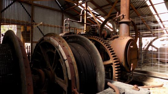 und auf angenehmen Wegen kann man durch das ehemalige Bergbaugelände wanden, in durch Maschendrahtgitter gesicherte ehemalige Schächte blicken und ausreichend Maschinenteile aus dieser Zeit wie diese Winde,