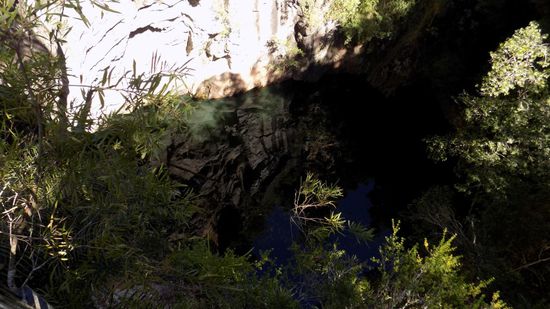 das Wasser darunter ist 73m tief und bis zum oberen Rand sind es auch nochmals gut 100m. Gleich nebenan die Dinner Falls