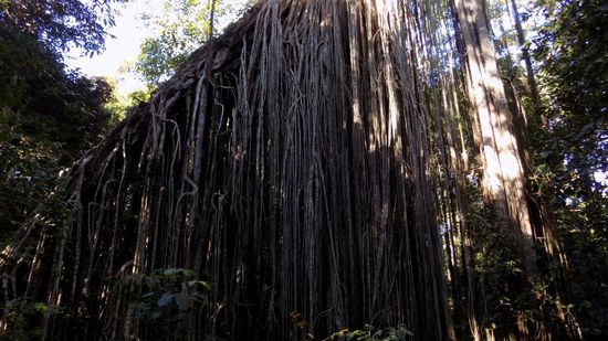 und andererseits ein Ausblick auf die 7 Sisters = 7 vulkanische Basaltkegel geboten wird. 20km weiter, mitten im tropischen Regenwald der Curtain Fig Tree.