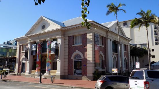 einem künstlich angelegten Badebereich, der im Gegensatz zum Meer hier Quallen- und Hai-frei ist. Über die Marina zu den Bootsstegen der Tauch-/Schnorchel Ausflugsboote, die hier täglich die Gäste zum Great Barrier Reef rausbringen (da wollten wir ursprünglich ja auch mitfahren…), geht es am alten Postamt und am noch älteren Gerichtsgebäude zur kleinen Art Gallery,