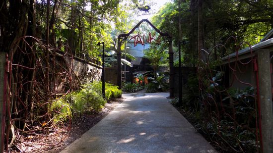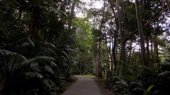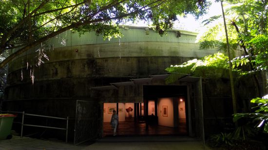 Mit seinen 922m zählt dieser Berg zu den höchsten, freistehenden pyramidenförmigen Bergen weltweit und kann bei ausreichender Kondition in ca. 7 Stunden (H/R) / 920Hm!! erwandert werden. Wir verschieben das auf ‚den nächsten Besuch hier in der Gegend‘ und fahren zum Botanischen Garten von Cairns, zur Tanks Art Gallery. Hinter diesem Eingangstor