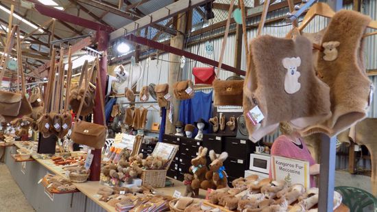 der anscheinend das Preisniveau der umliegenden Supermärkte vorzugeben scheint, denn mit AUD5 für einen durchschnittlichen Kopf Eisbergsalat haben wir hier wohl das Spitzenniveau erreicht – oder sind das nur Ironman Nebenwirkungen? Wir wollen das eigentlich nicht so genau wissen, fahren nochmals auf den SP Gordonvale Rest Area am Bruce Highway und ziehen am nächsten Tag gegen Norden bis Kuranda weiter. Dieses kleine, auf etwa 300m im UNESCO geschützten Regenwald gelegene Städtchen ist DAS Ausflugsziel für Cairns, DER Besuchermagnet dieser Region, denn hier werden täglich von 10:00 bis 15:30 zwei Kunsthandwerk- / Hippie Märkte abgehaltem, die keine (Souvenir-) Wünsche offen lassen. Uns beeindruckte vor allem dieser Stand mit Produkten aus Känguru Fell,